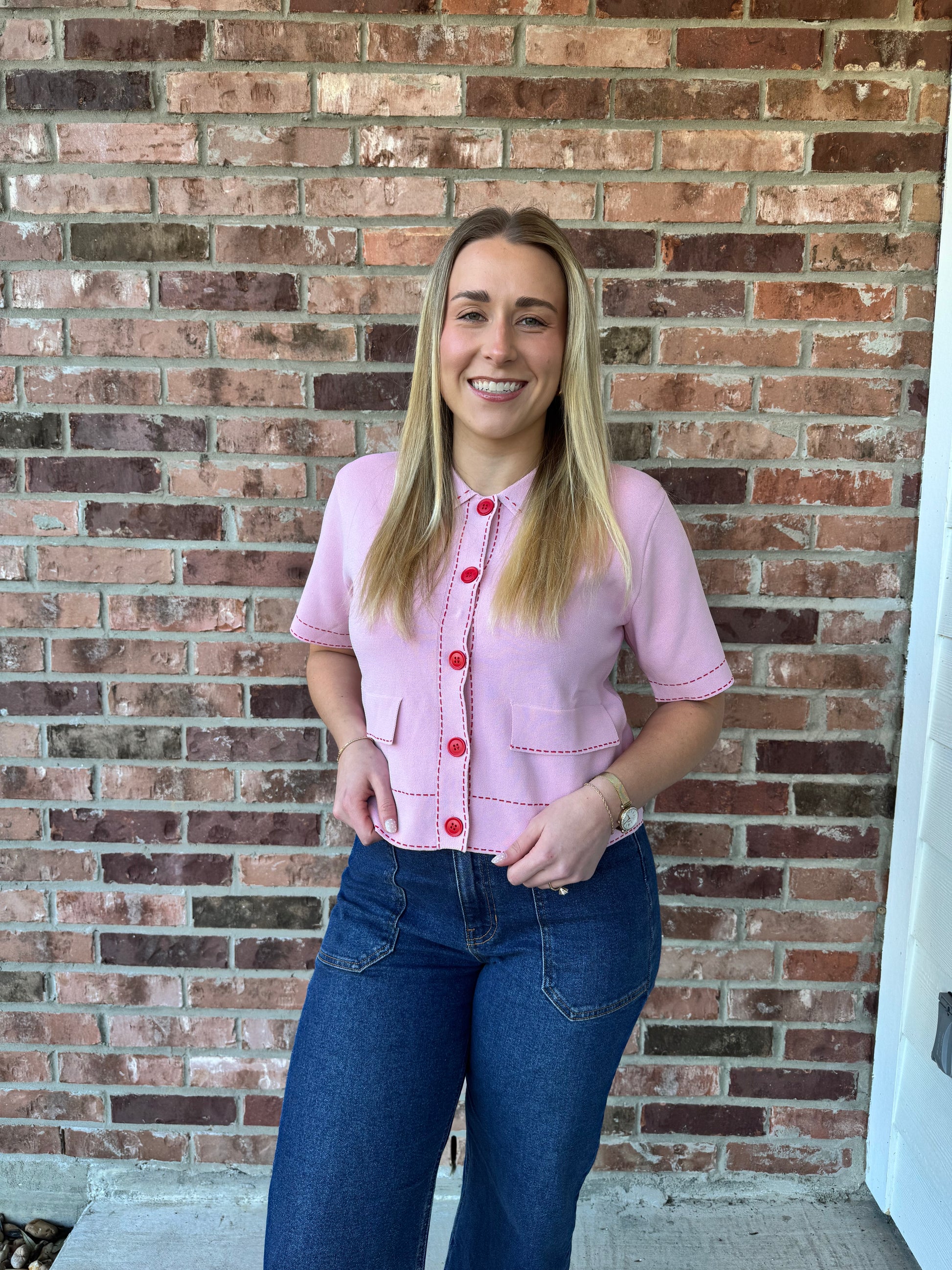 Make a bold Valentine's statement in this adorable button-down top. Crafted from soft, stretchy viscose, it features a charming red and pink color palette with eye-catching red buttons and decorative stitch detailing. Perfect for spreading the love this season—or any time you want to turn heads.