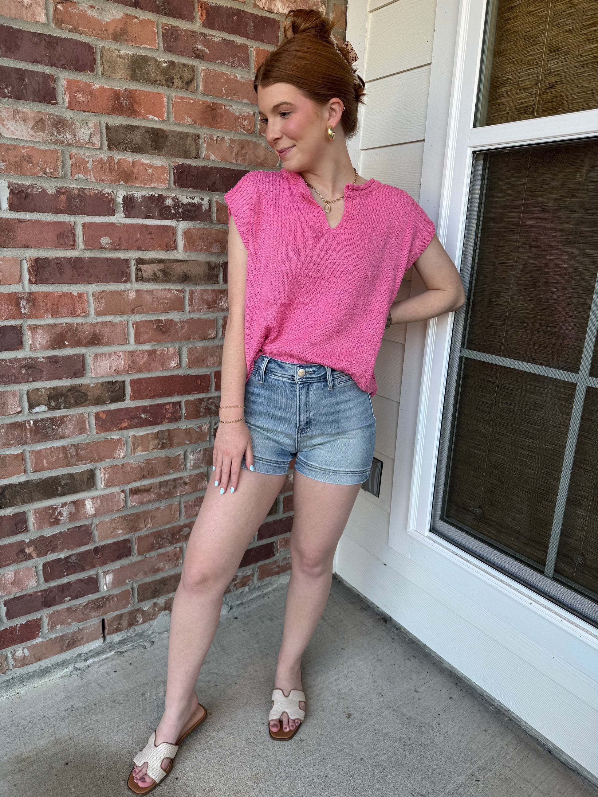 Stay cool and chic with our Breezy Textured Sleeveless Top! Featuring a playful popcorn texture, a trendy notched neckline, and a relaxed drop shoulder fit, this knit top is perfect for a breezy and casual look. Stay stylish and comfortable all day long!
