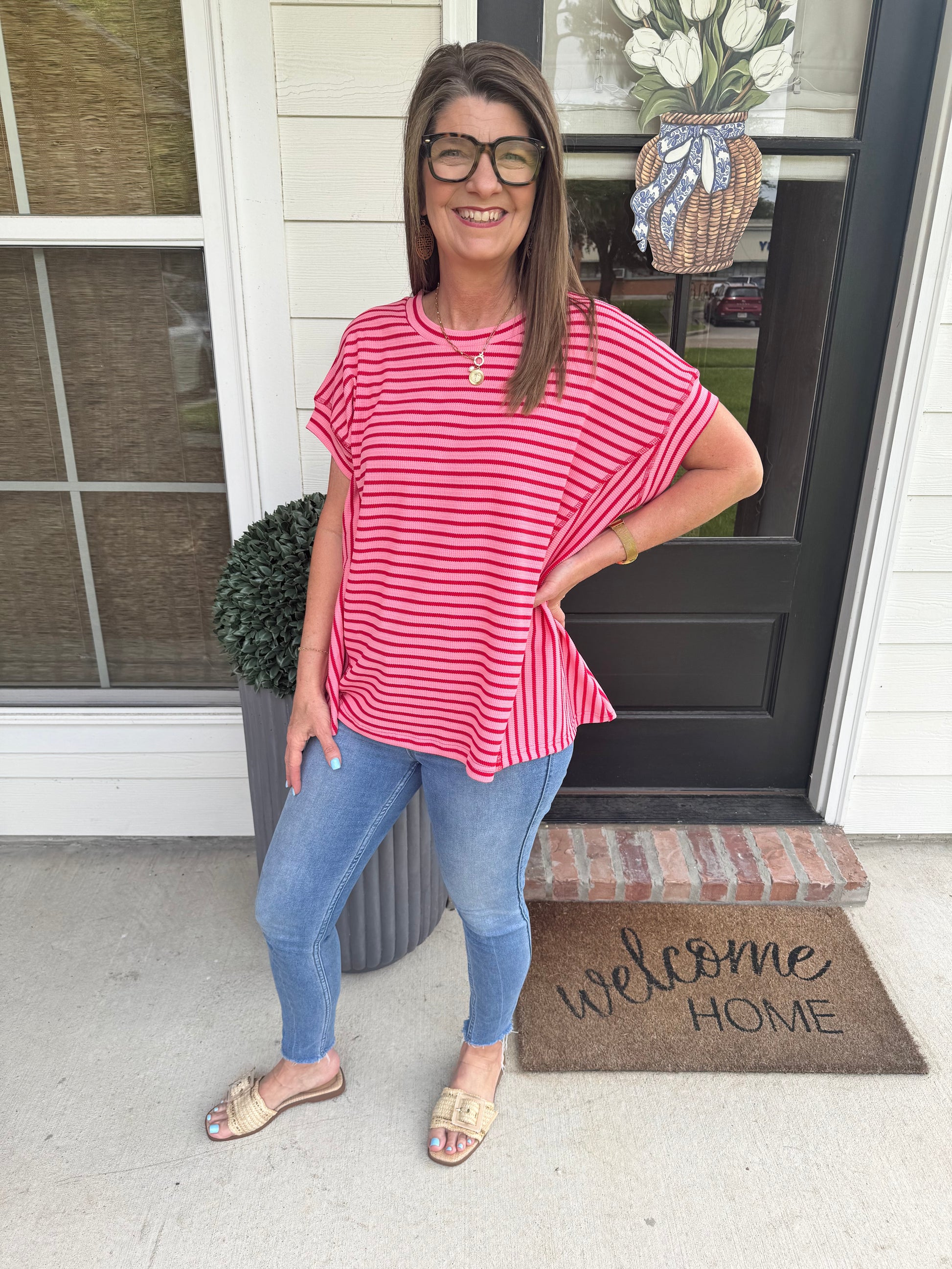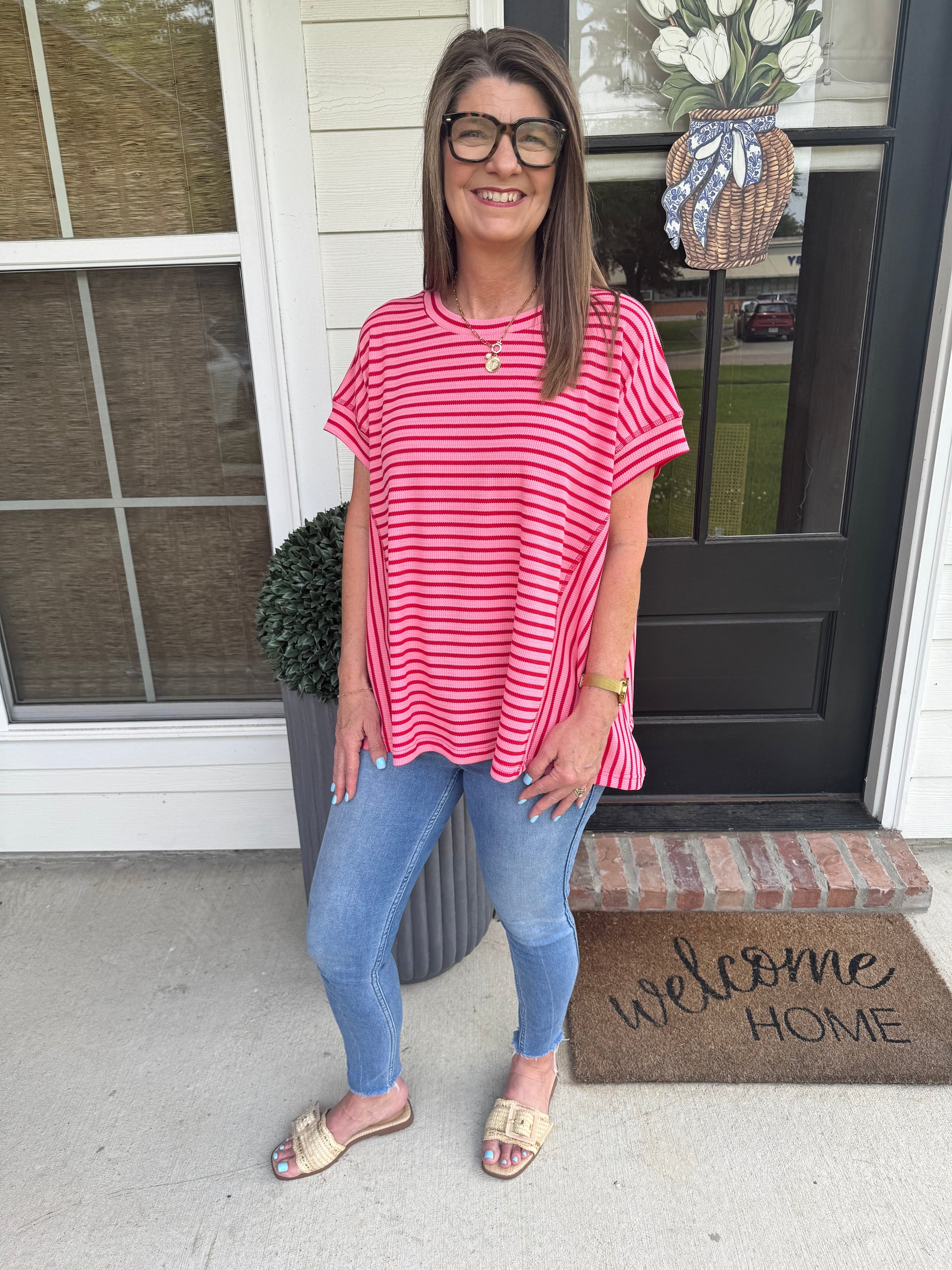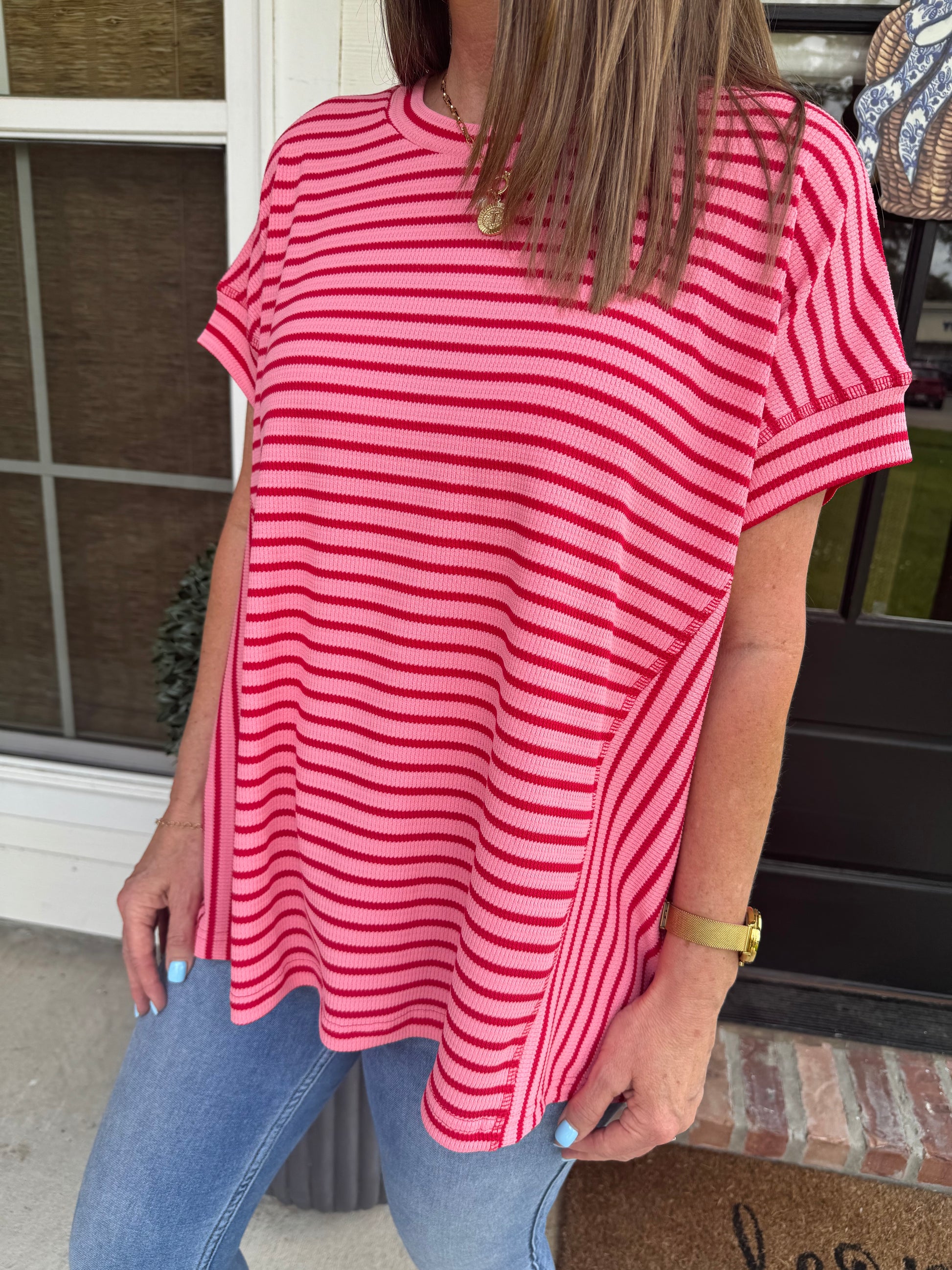 WThis oversized tee has a waffle knit material that's perfect for dressing up or down. It's very lightweight and runs oversized, making it ideal for any occasion. Plus, it's a twist on the classic tee, so you'll stand out in style!