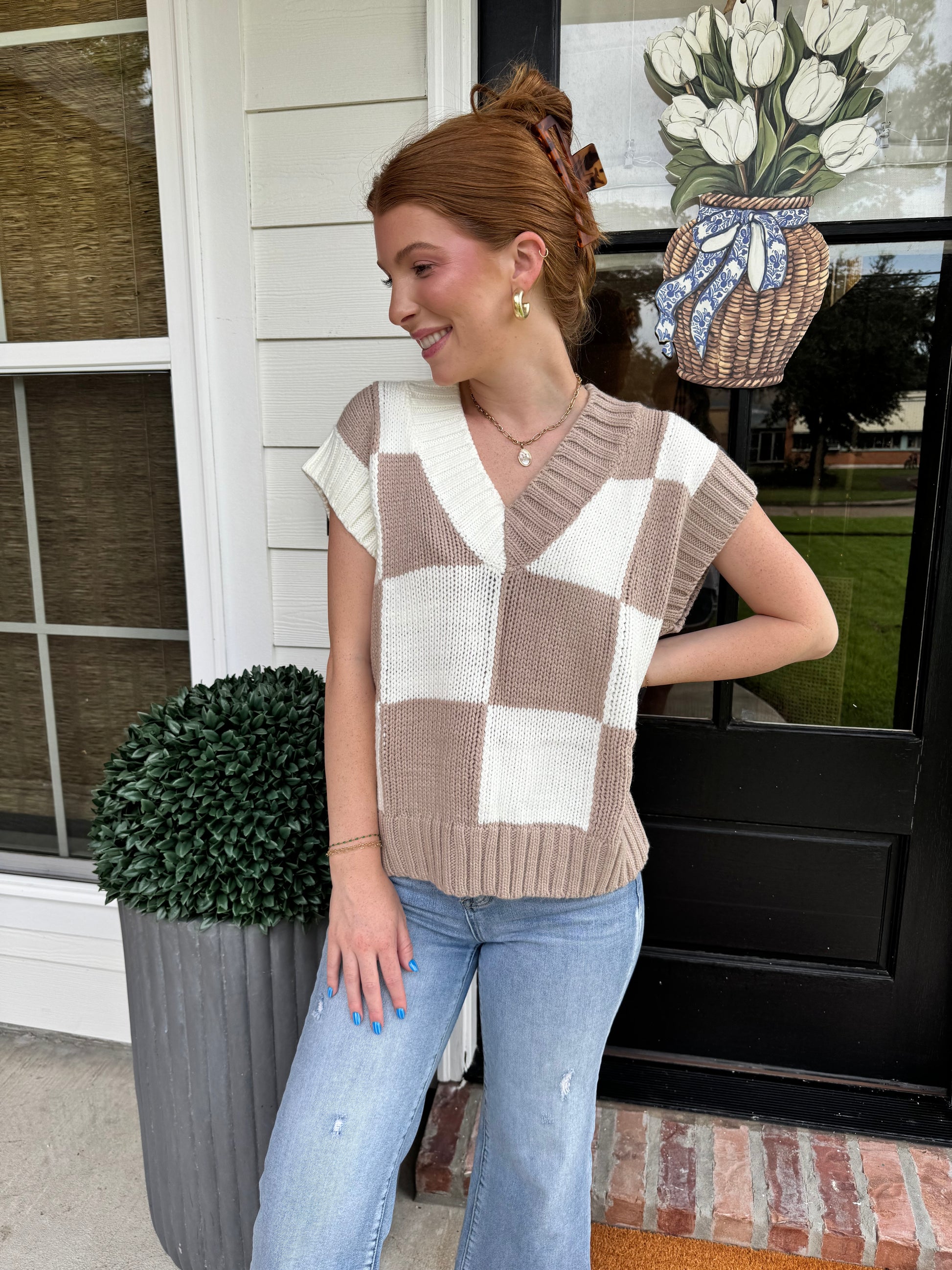 Effortlessly layer up with our Checkered Sweater Vest. This playful knit vest with a deep v neck offers a relaxed fit for ultimate comfort. Perfect for any occasion, it adds a touch of fun to your wardrobe.