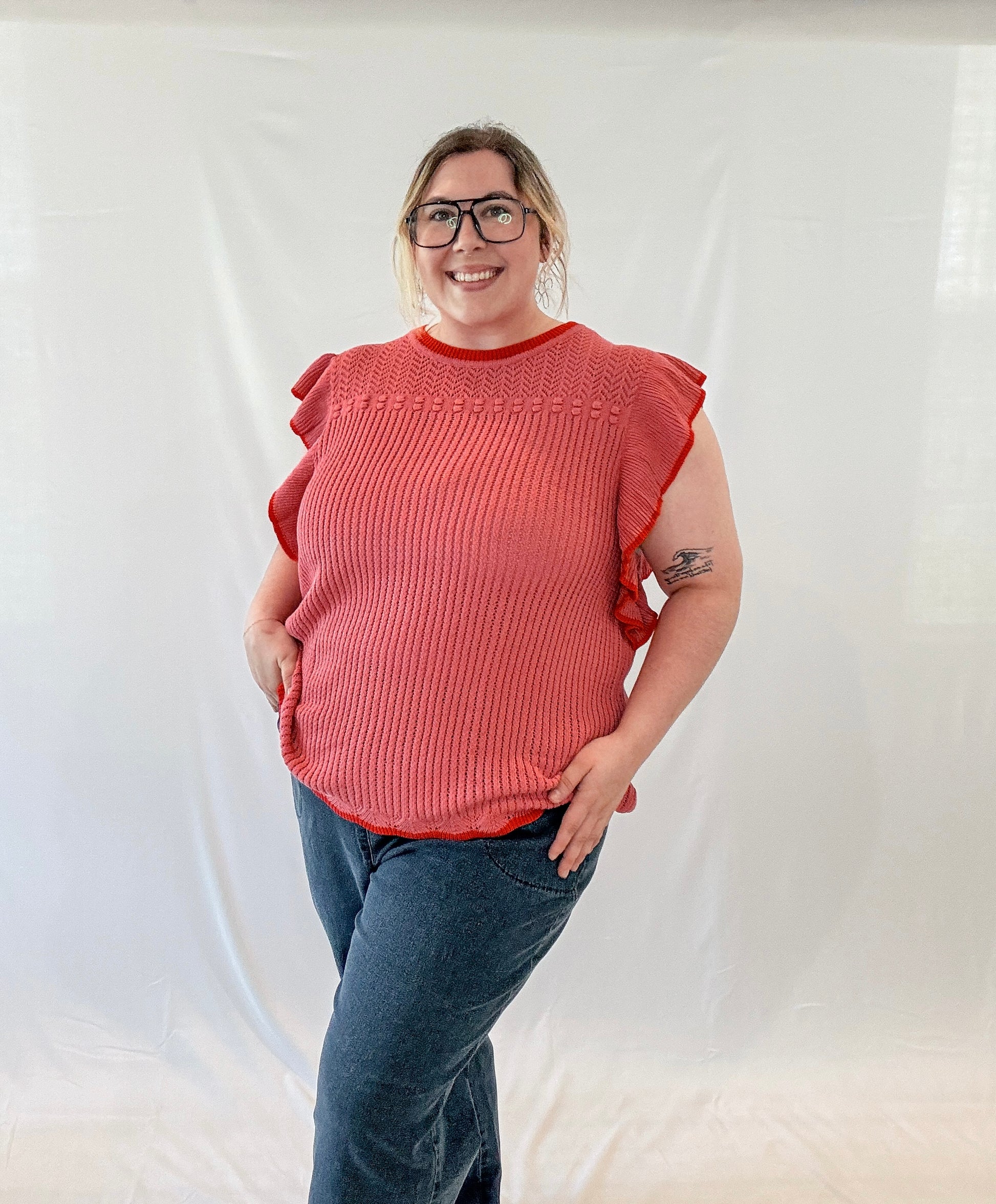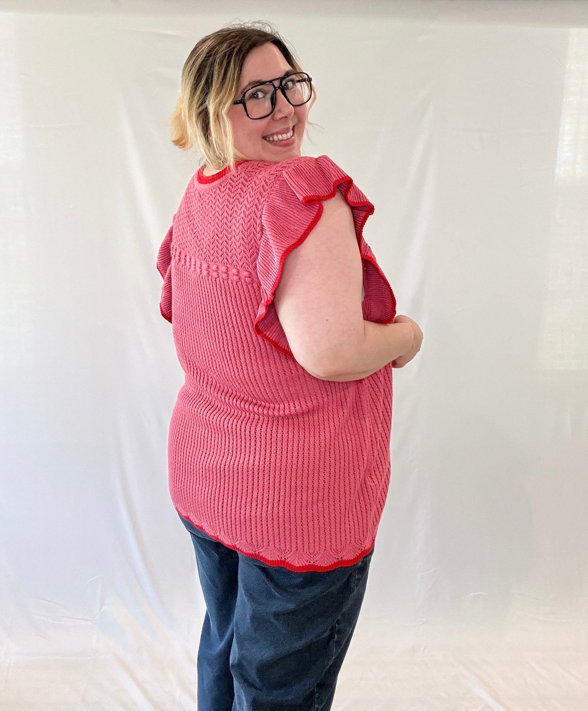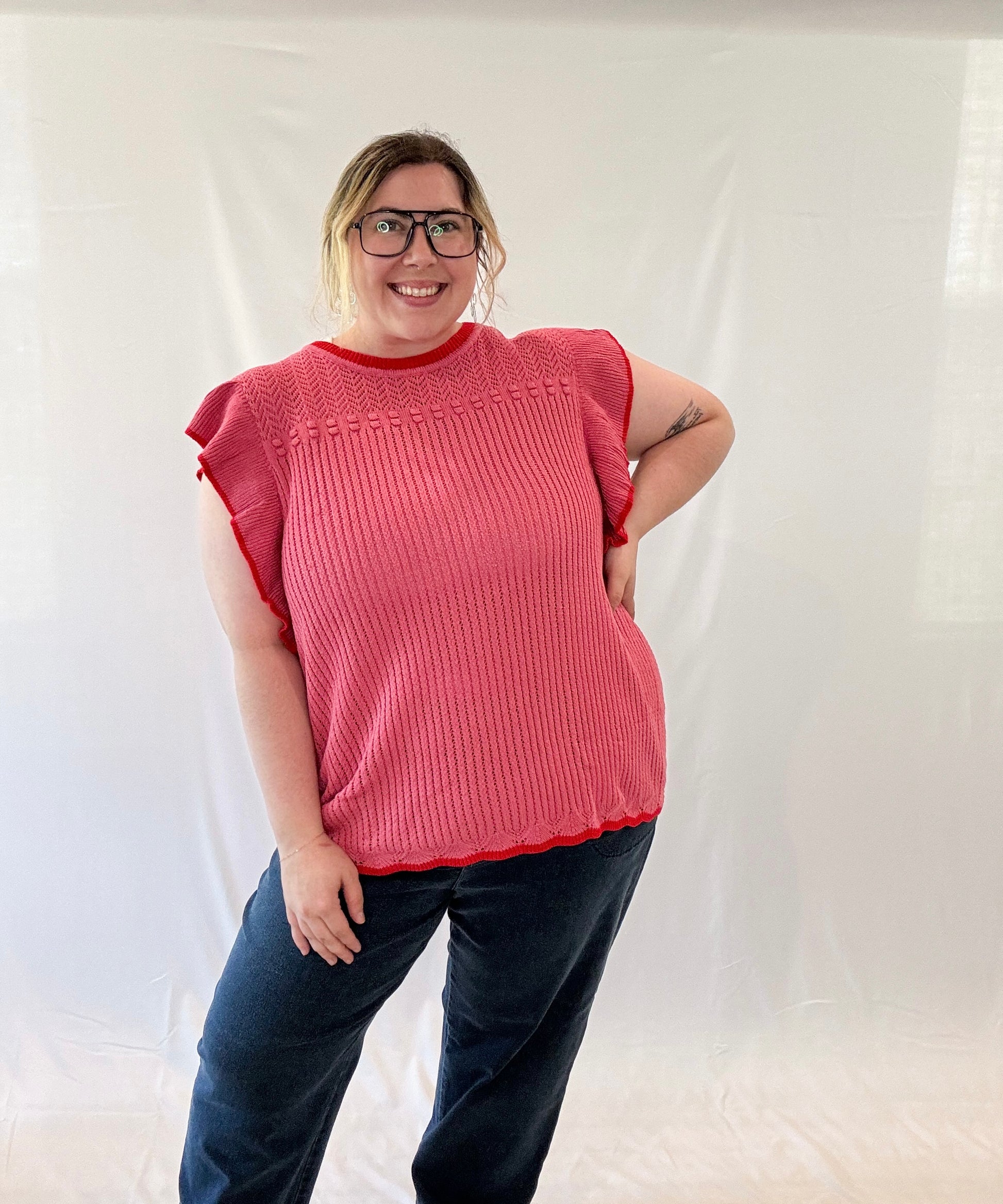 Embrace your flirty side with the Cupid Ruffle Sleeve Plus Size Top. Its ruffle sleeves and red trim add a playful touch to this knit top. Perfect for any occasion, it's sure to make a statement. The model is wearing a 3XL in this top.