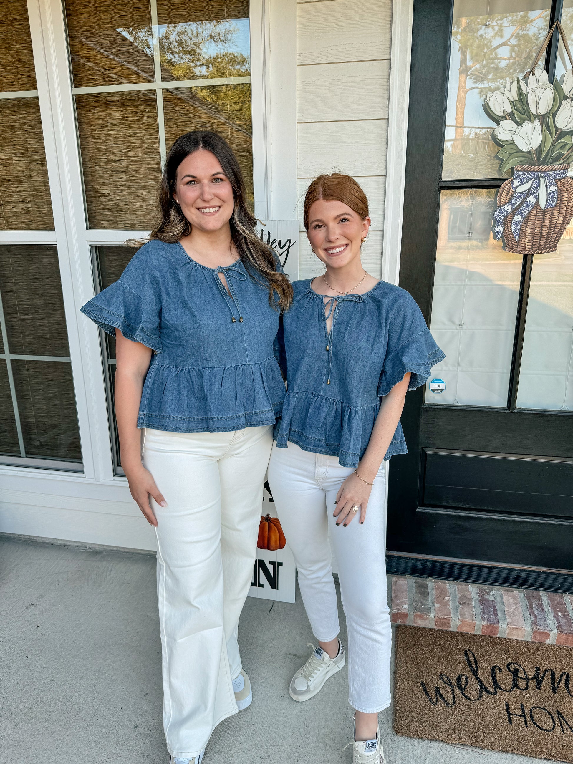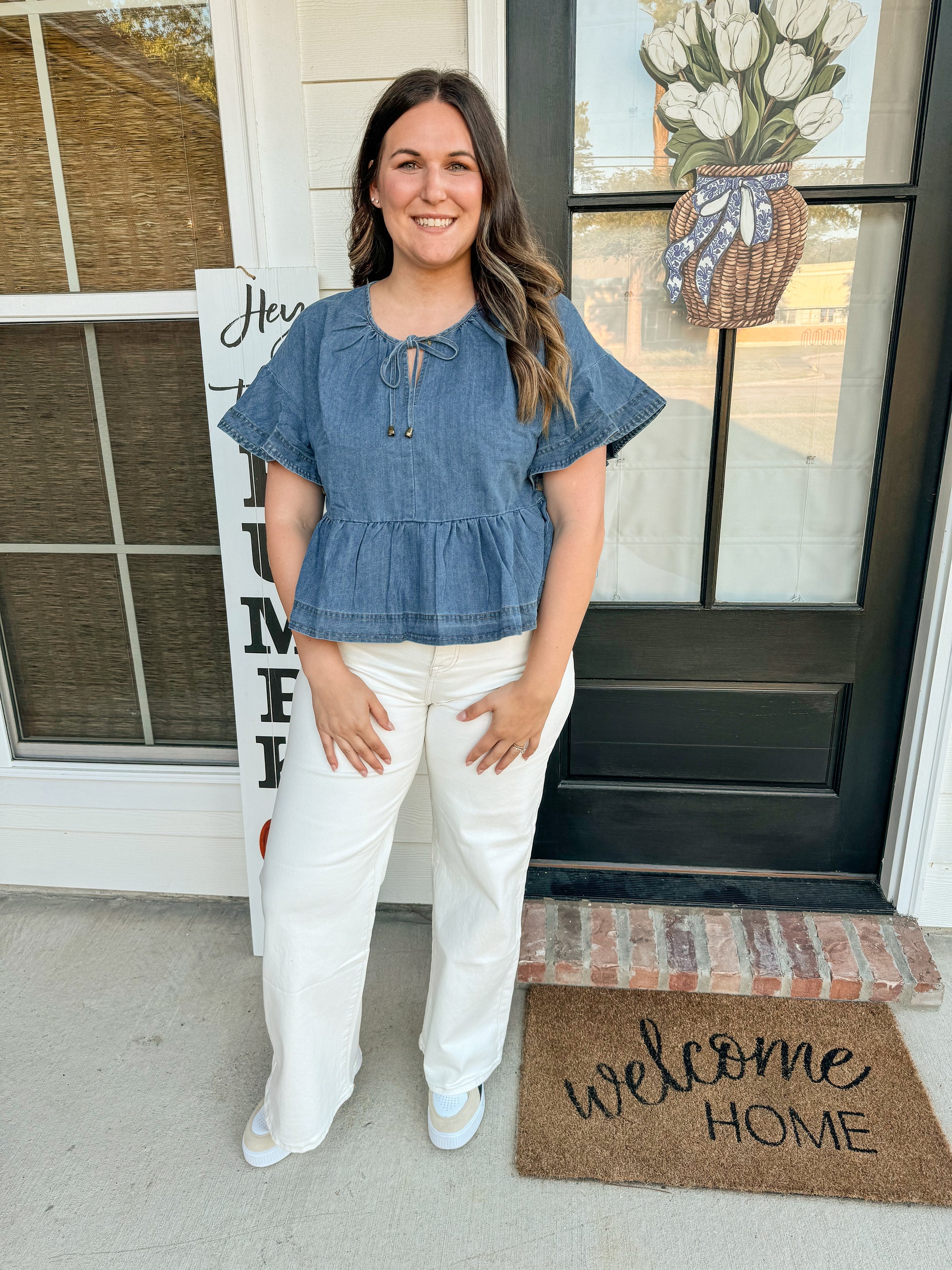 Crafted from soft denim material, the Daring Denim Peplum Top offers versatility for any occasion. Featuring a tie at the top, it can be dressed up or down to suit your style.