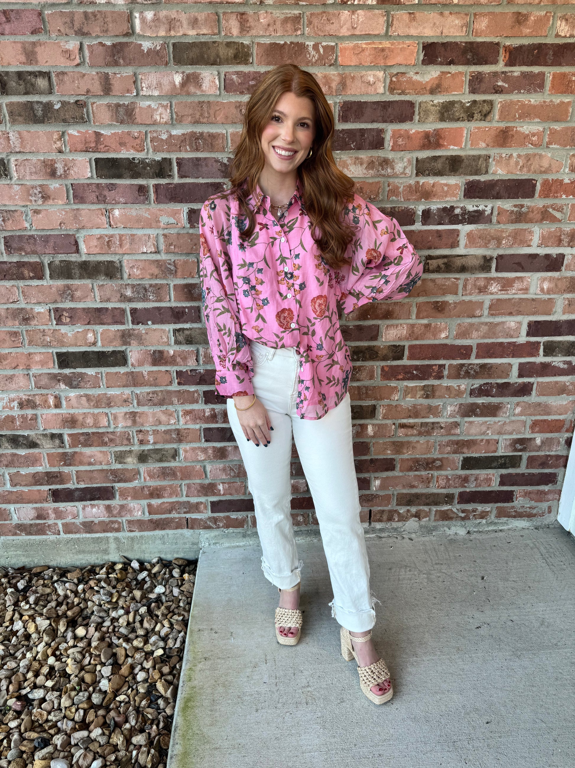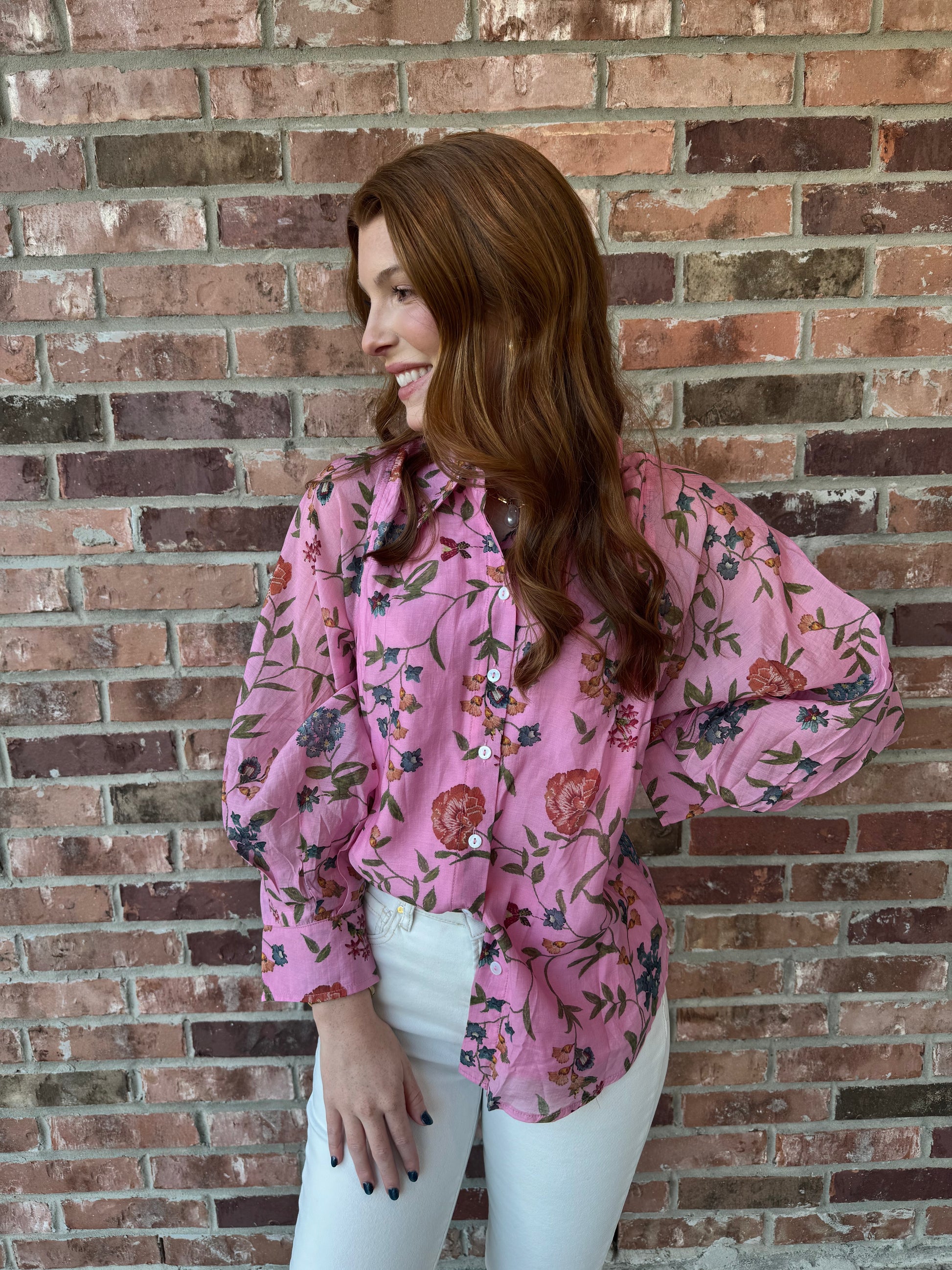 Meet your new favorite top! This charming button-down features a gorgeous pink floral print on non-sheer fabric that actually covers what matters. Balloon sleeves add a playful touch while the flattering cut keeps things effortlessly chic. Wear it solo or layer it—this full-length beauty works for everything from brunch to date night.