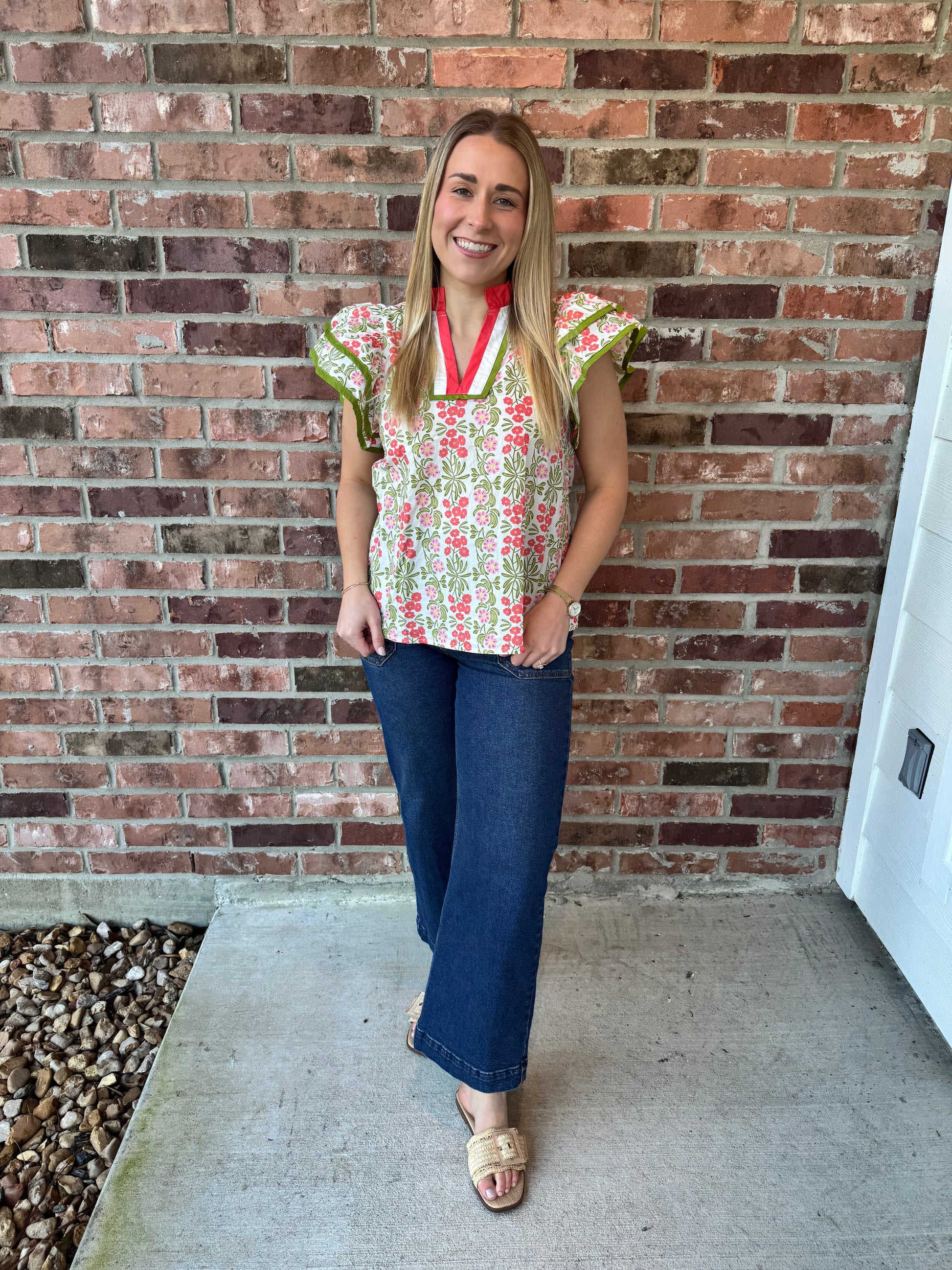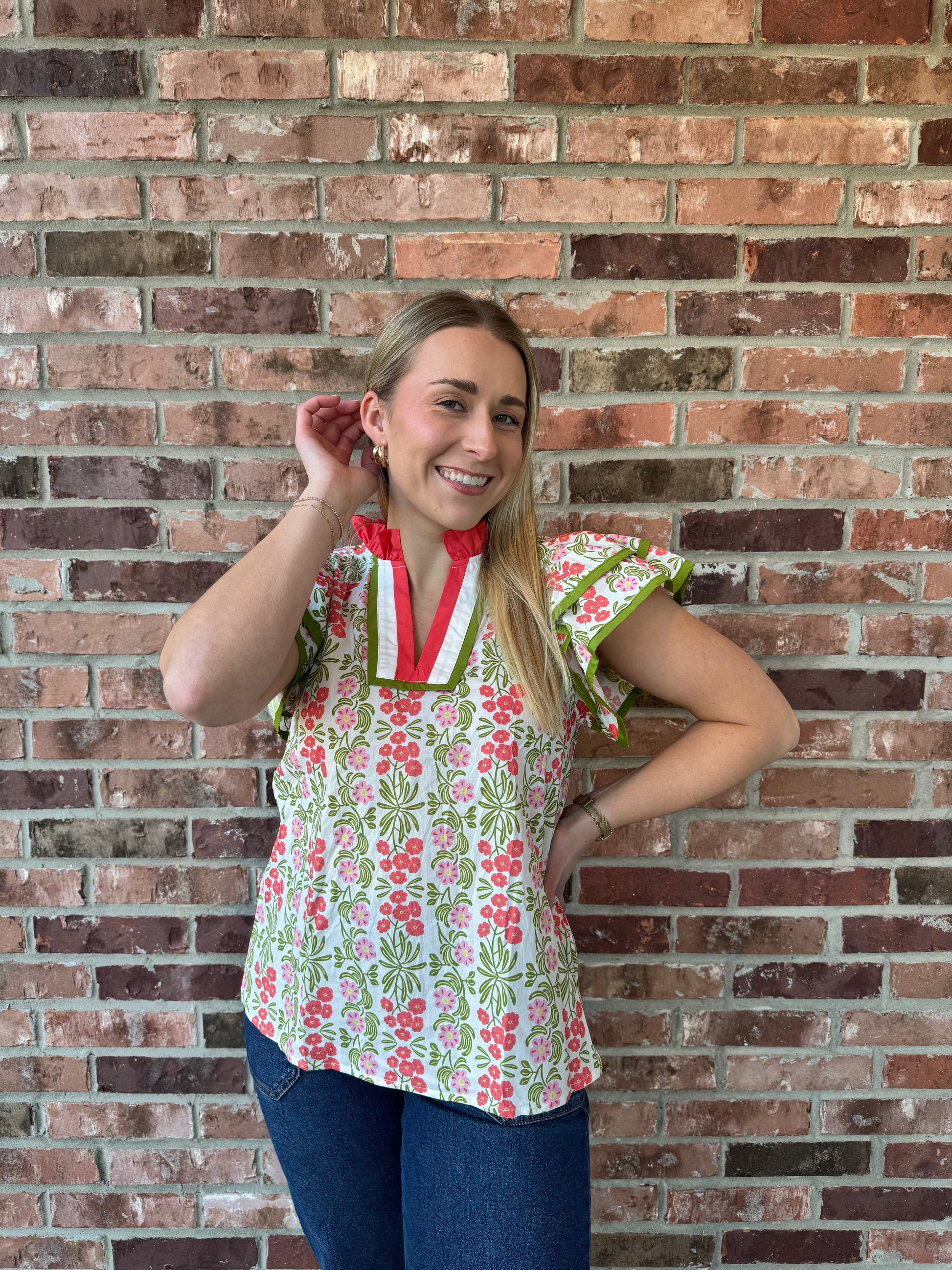 Embrace your free spirit in this charming ruffle sleeve top, where delicate florals meet feminine details. The soft v-neckline draws the eye while voluminous ruffle sleeves add movement and playfulness to every wear. Finished with dainty ruffle trim, this piece celebrates your bold, carefree style—perfect for brunch dates, garden parties, or whenever you want to feel effortlessly chic and utterly yourself.