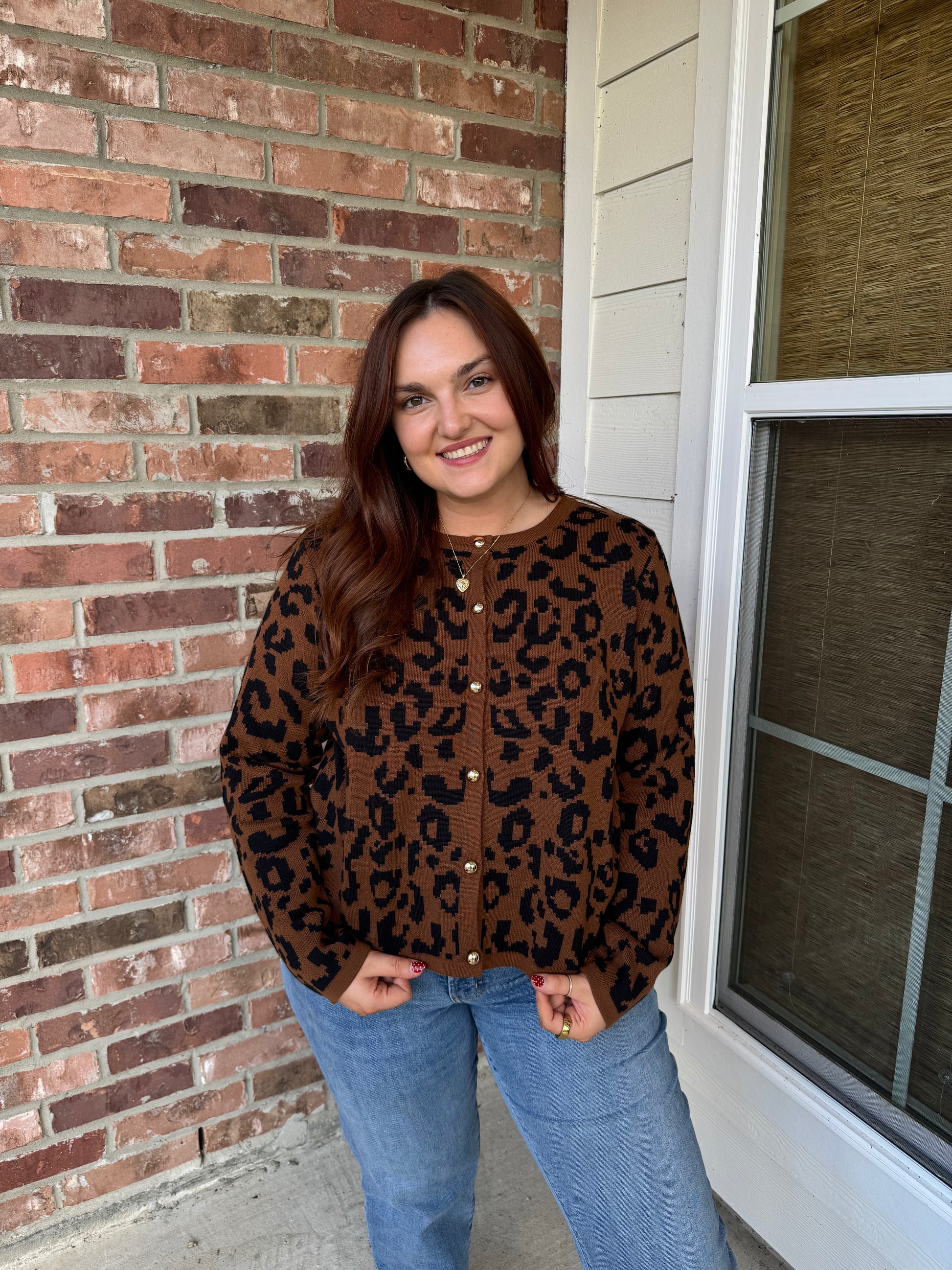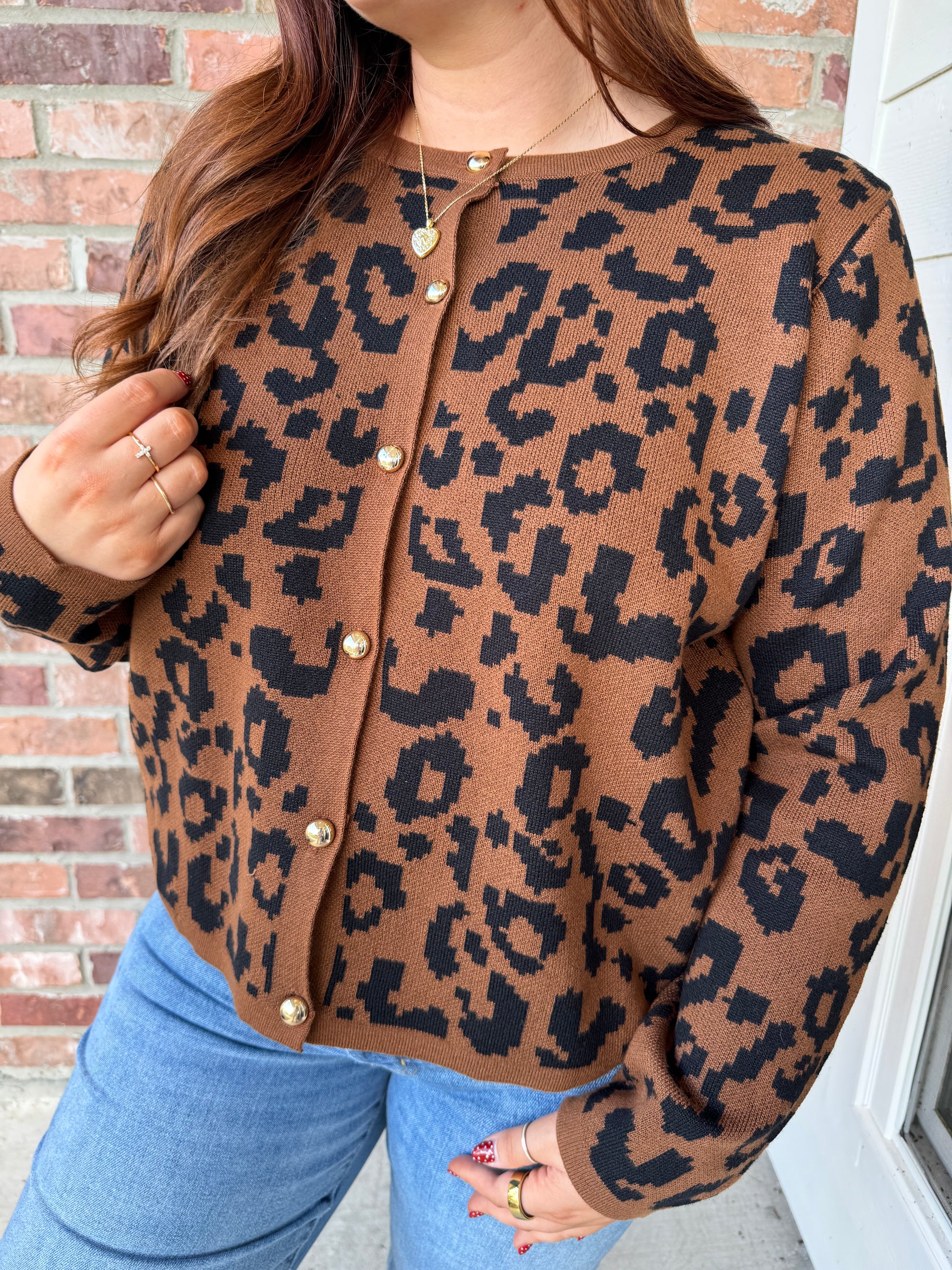 Unleash your wild side with the Lizzy Leopard Gold Button Sweater—a statement cardigan that brings untamed style to your everyday rotation. Featuring a bold leopard print in warm gold tones and classic button-down front, this long-sleeve piece is your ticket to effortless edge. Layer it over basics for instant personality, or pair it with red for a daring color clash that turns heads. Perfect for those who refuse to blend in.