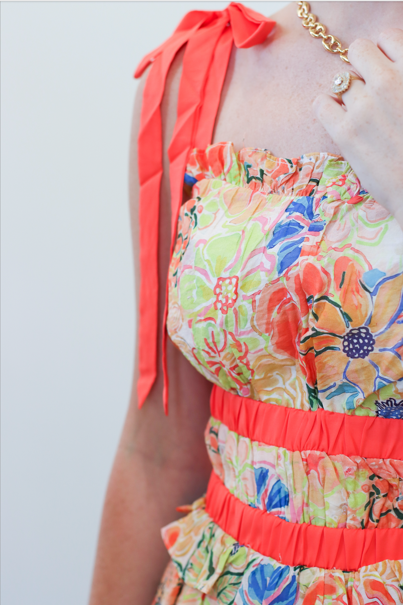 This playful floral skort romper features a ruffled neckline and wide tying straps in a contrasting fabric for a fun, flirty look. The fitted bodice and high elastic waist with tiered contrast binding highlight your shape, while the romper shorts with a mini skirt overlay add a charming, breezy vibe perfect for sunny days by the seaside.
