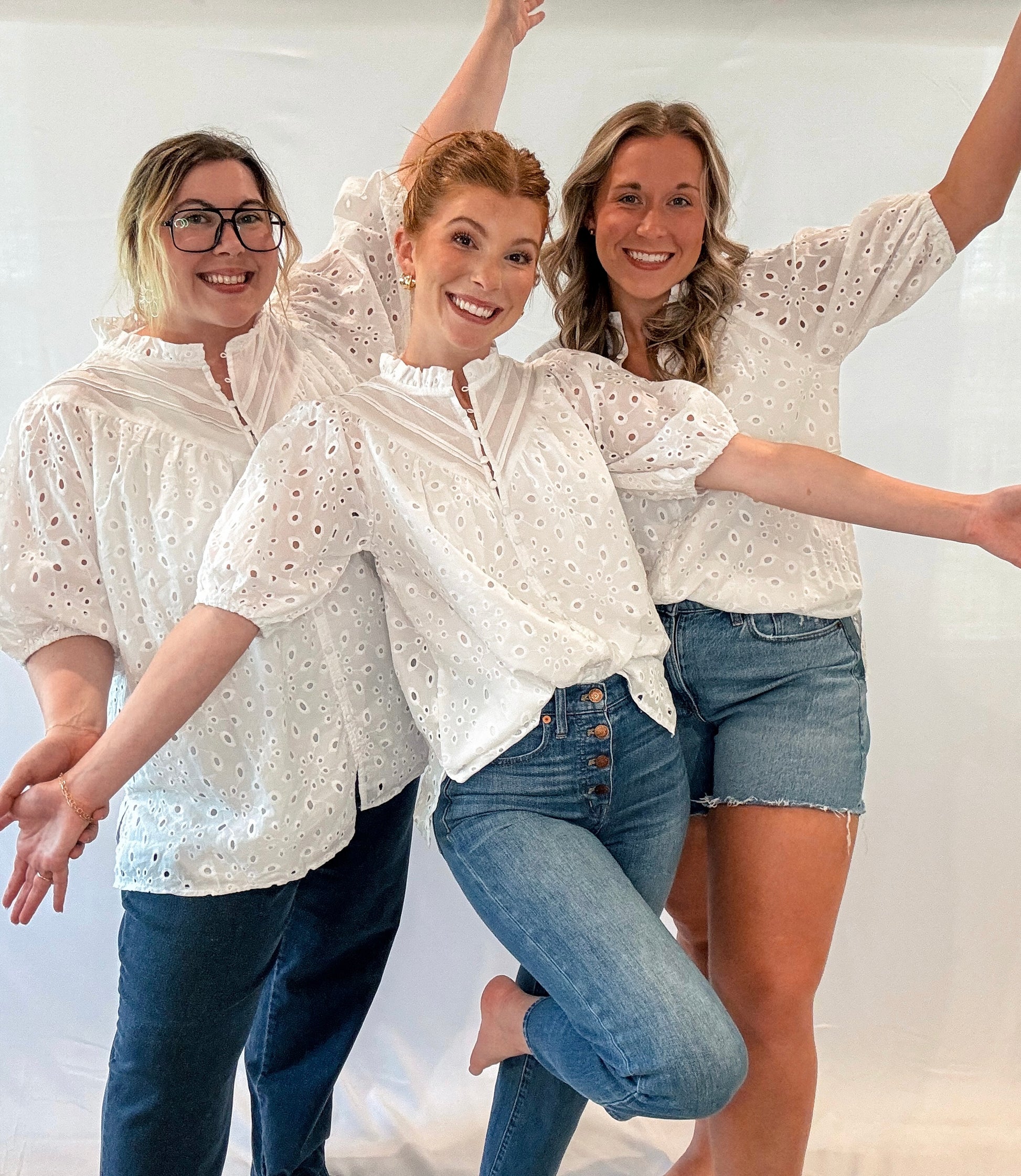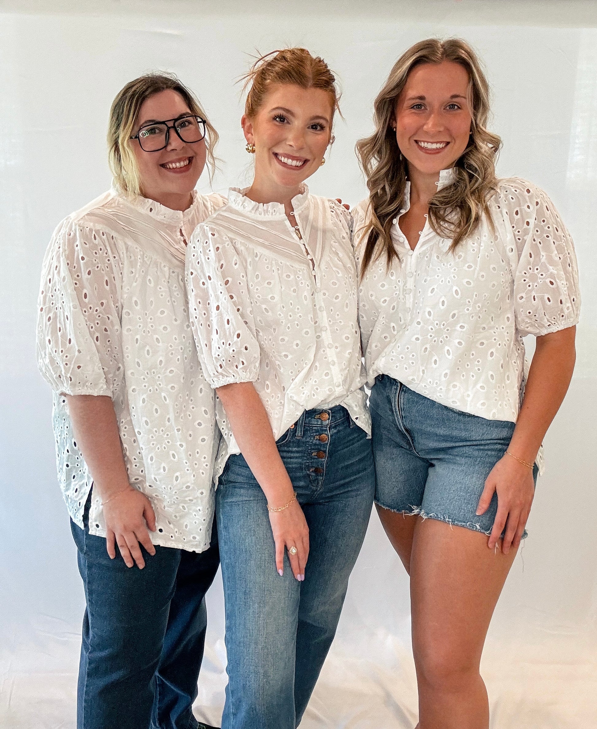 Get ready to dress up with this eye-catching White Eyelet Embroidered Top! The intricate eyelet design adds a touch of elegance, while the easy fit makes it perfect for any occasion. Turn heads effortlessly in this trendy top! The model on the left is wearing a 3x, middle is wearing a small, and left is wearing a medium.